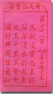 姜太公,怀才不遇,只有在山水间寄托自己的凌云大志。他在渭水钓鱼,荷枝作著名的古语——“姜太公钓鱼,愿者上钩”。当时,纣王无道,群雄并举,周文王不远千里而来,到渭水之滨寻访隐居的姜太公,终于,姜太公协助周文王、周武王,打败了纣王,建立周朝帝业。此签虽为中吉,但寓意吉祥,求得者,只要能顺应天时,立心良善,必然万事如意。