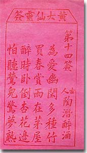 签语描写东坡归隐的清雅生活:为了幽闲,在居所周围种满绿竹,把时间都交托给春天,或躲在茅屋里赏雨,或醉后眠在杏花旁边,安然入梦乡,最怕被黄莺的歌声吵醒。此乃安逸之象。